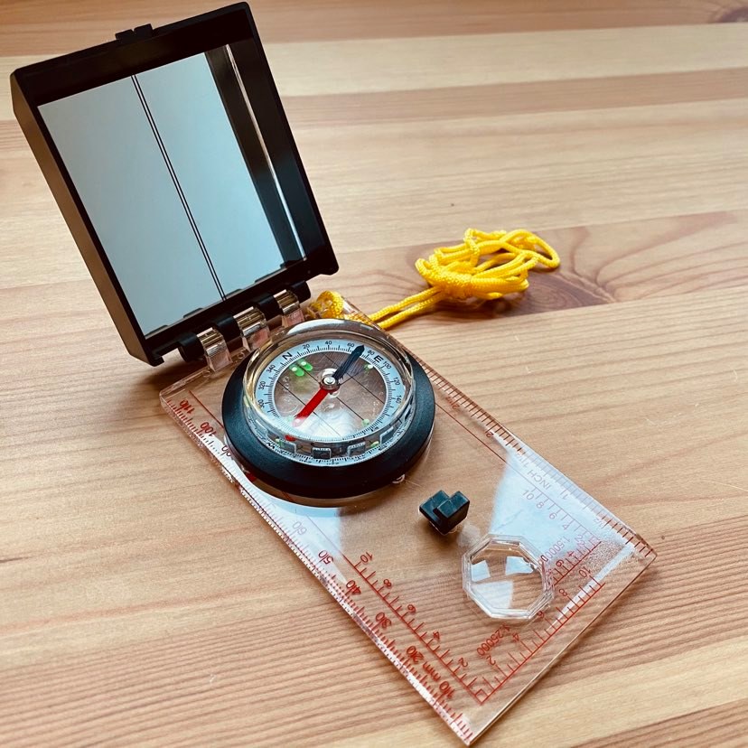 Buzola / busola se zrcátkem. Slouží k určování světových stran, orientaci v terénu a měření azimutu.