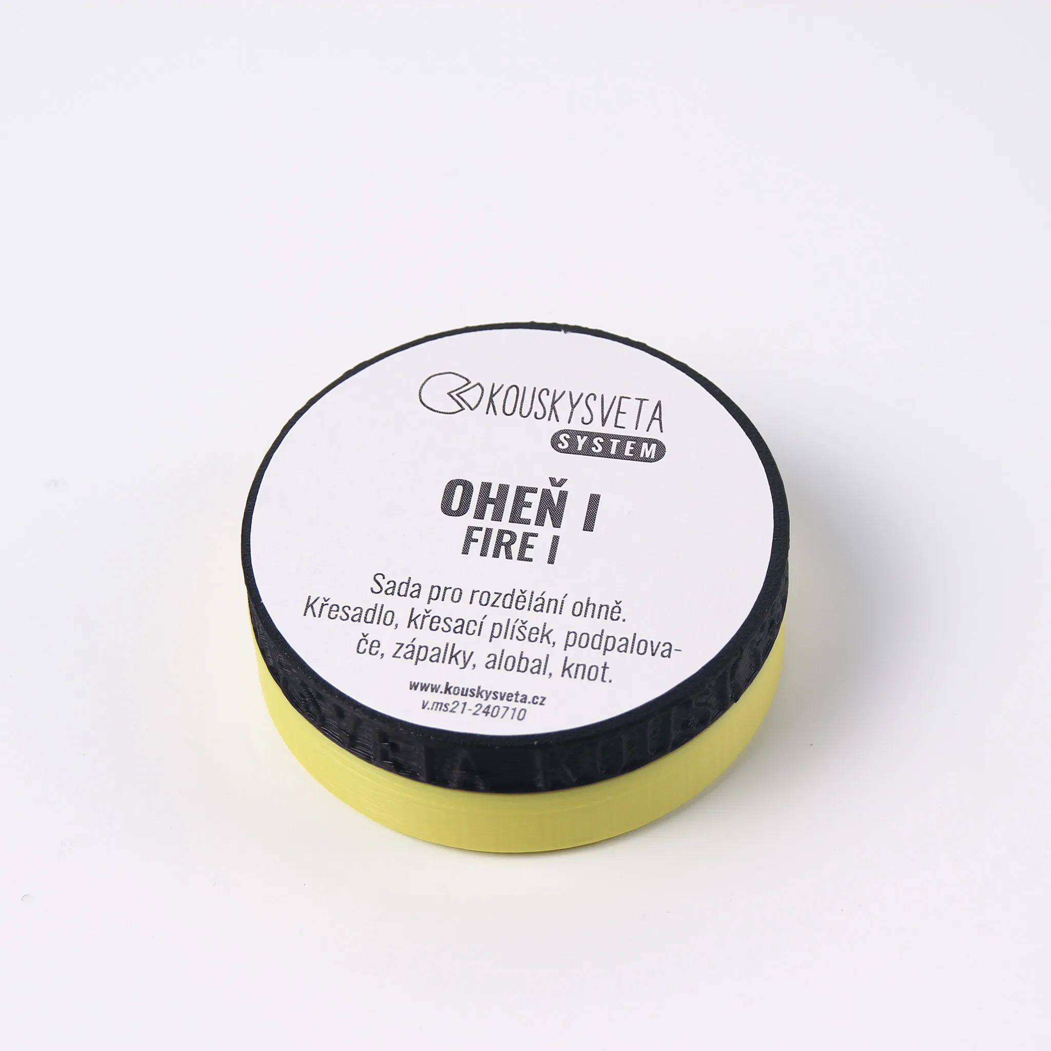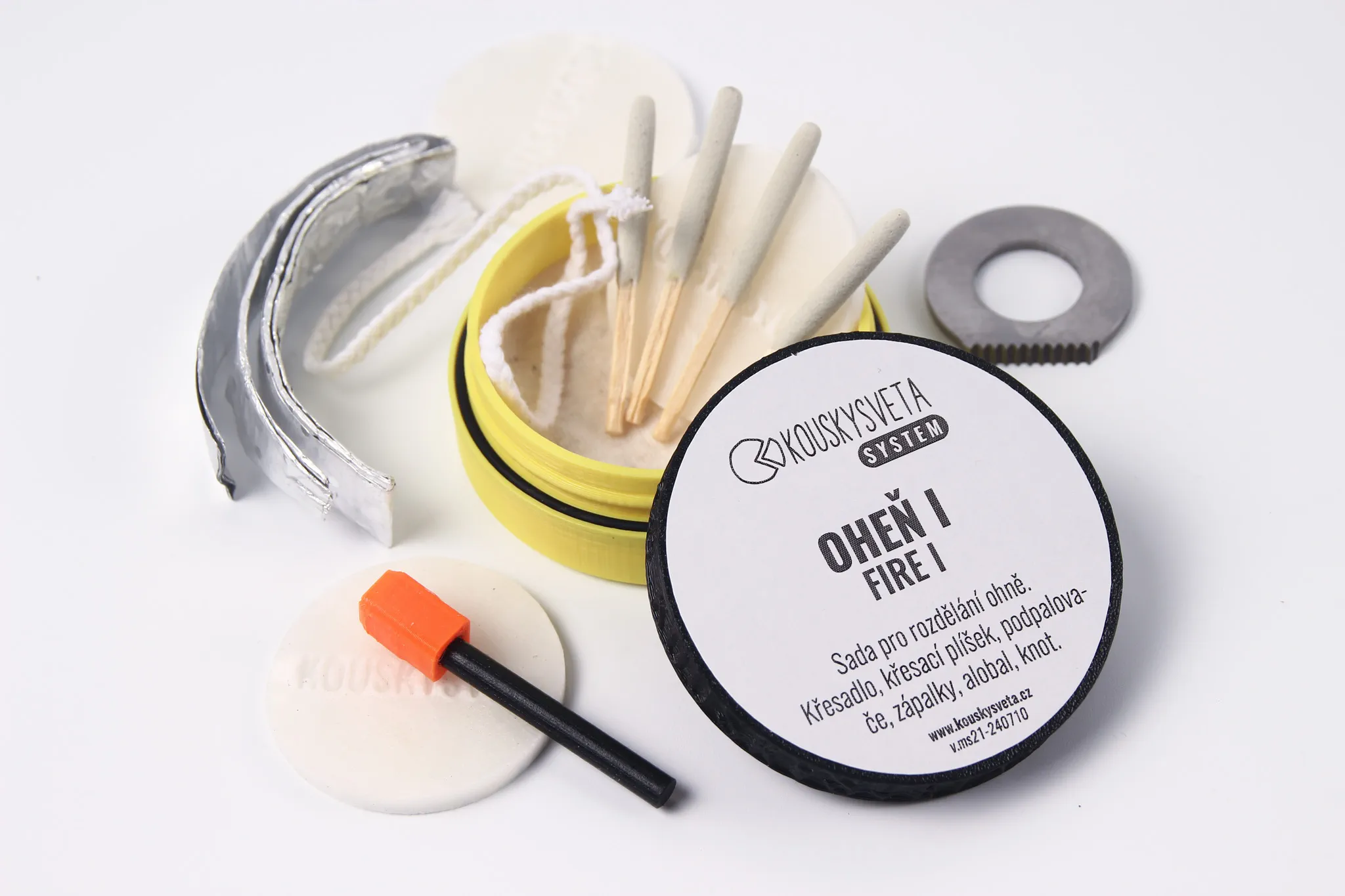 Sada pro rozdělání ohně. Obsahuje také křesadlo.