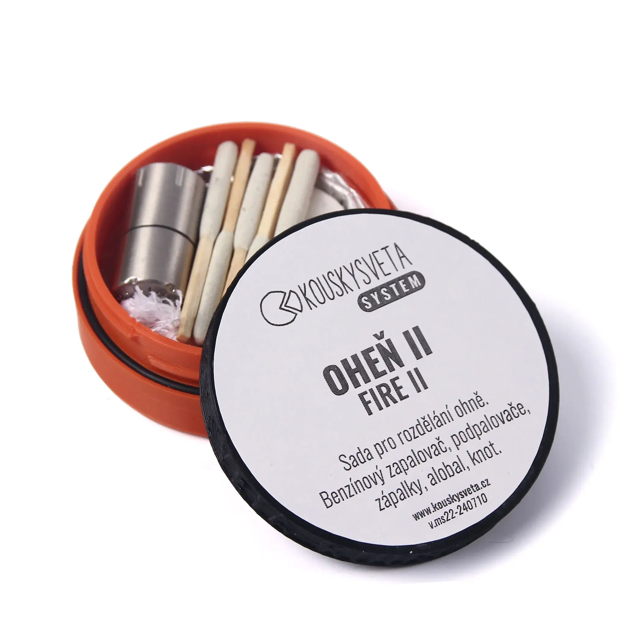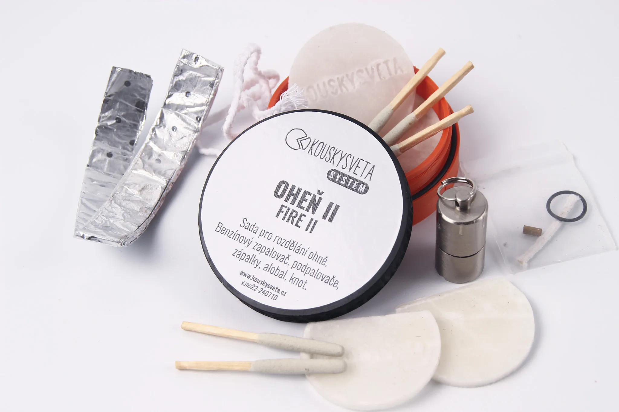 Obsah: Benzínový zapalovač, podpalovače kouskysveta (3ks), vatový tampon, větru a vodě odolné zápalky MilTec (5ks), alobal 30×30 cm, knot 20cm, škrtátko.