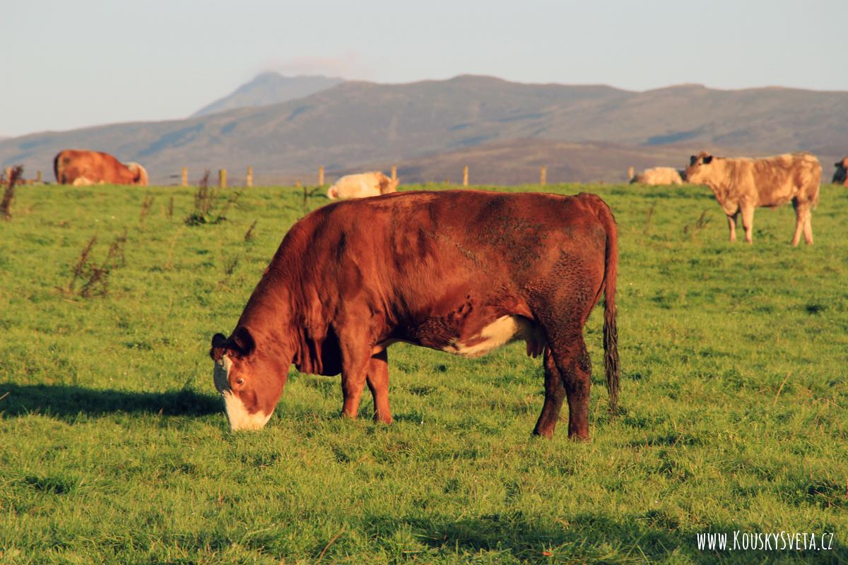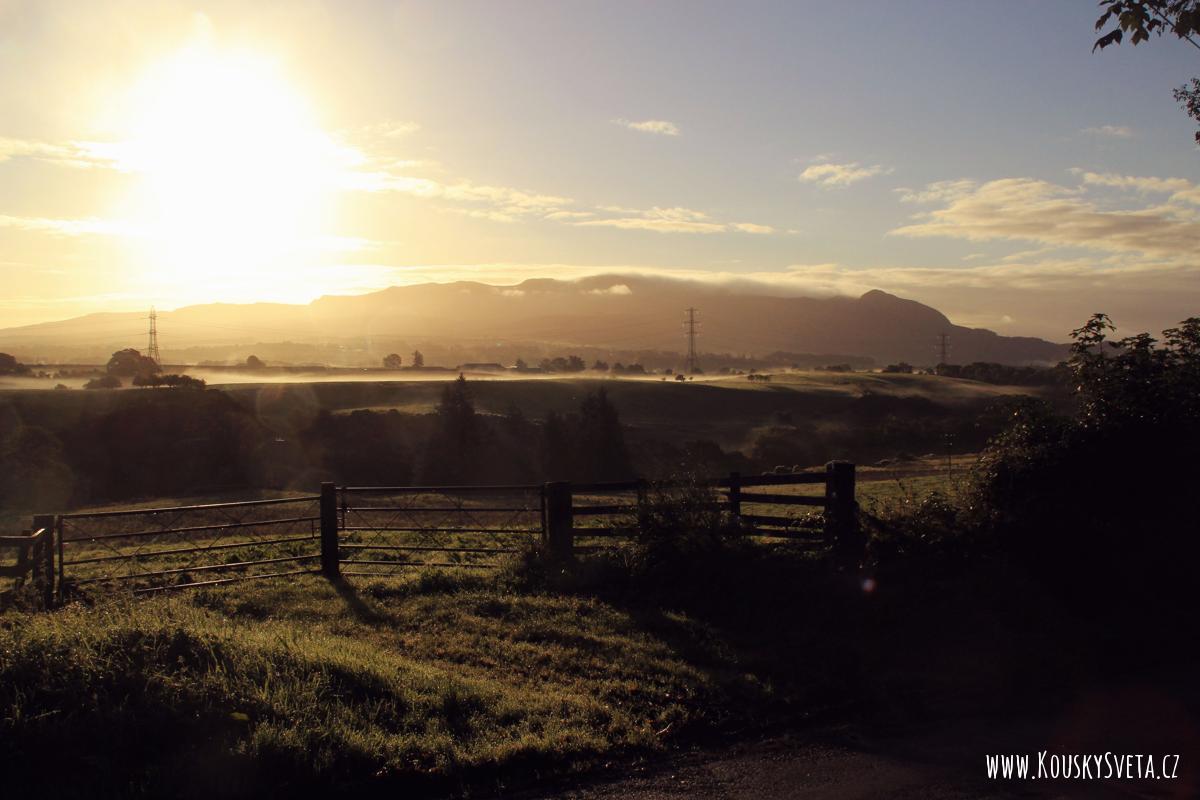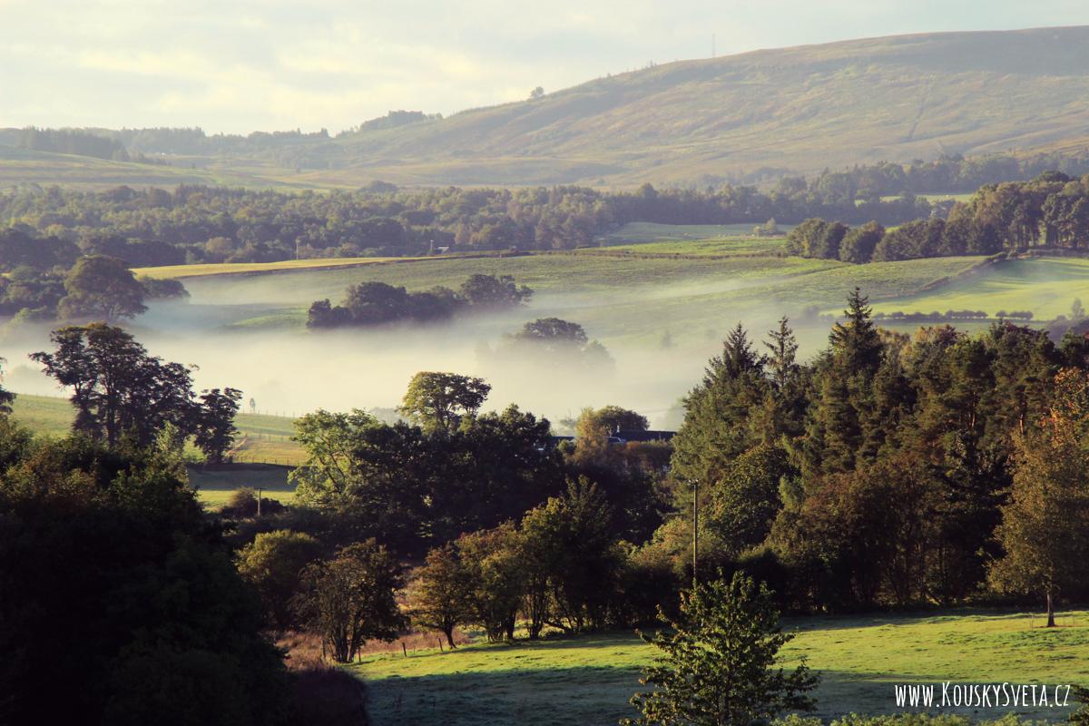 Spali jsme asi 11 hodin! Byli jsme asi opravdu unavení z megabusu a ostatního. Karče přes noc nateklo koleno do obřích rozměrů. ALE -přivítala nás krásná panoramata skotské vysočiny vystupující z ranní mlhy a také kráva, tak jsme na chvilku zapomněli na naše bolístky. Vše jsme pečlivě vyfotili, udělali si vločkovou kaši a vyrazili dál. Zašli jsme si asi 1 míli z West Highland Way do městečka Drymen, kde jsme koupili obvaz a Scottish pie, což je koláč plněný masem. Problém byl, že se měl dát ještě na 15 minut do trouby. Ale byl dobrej i tak 🙂