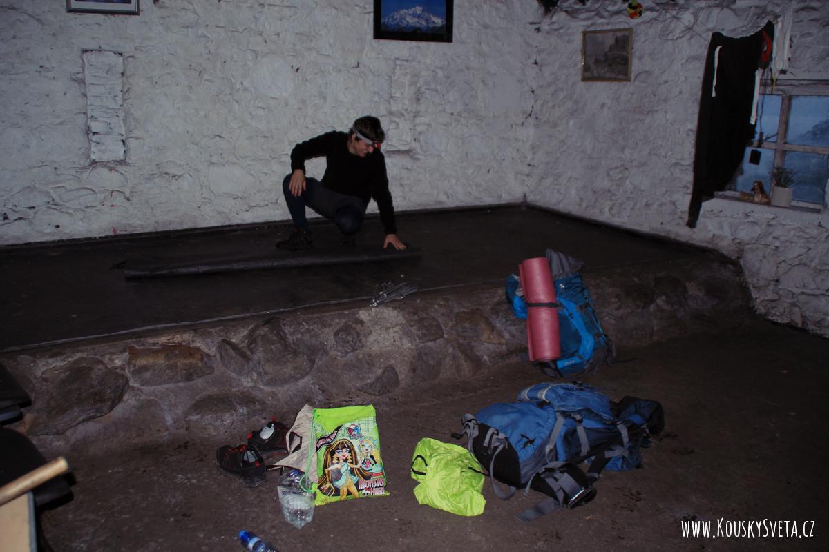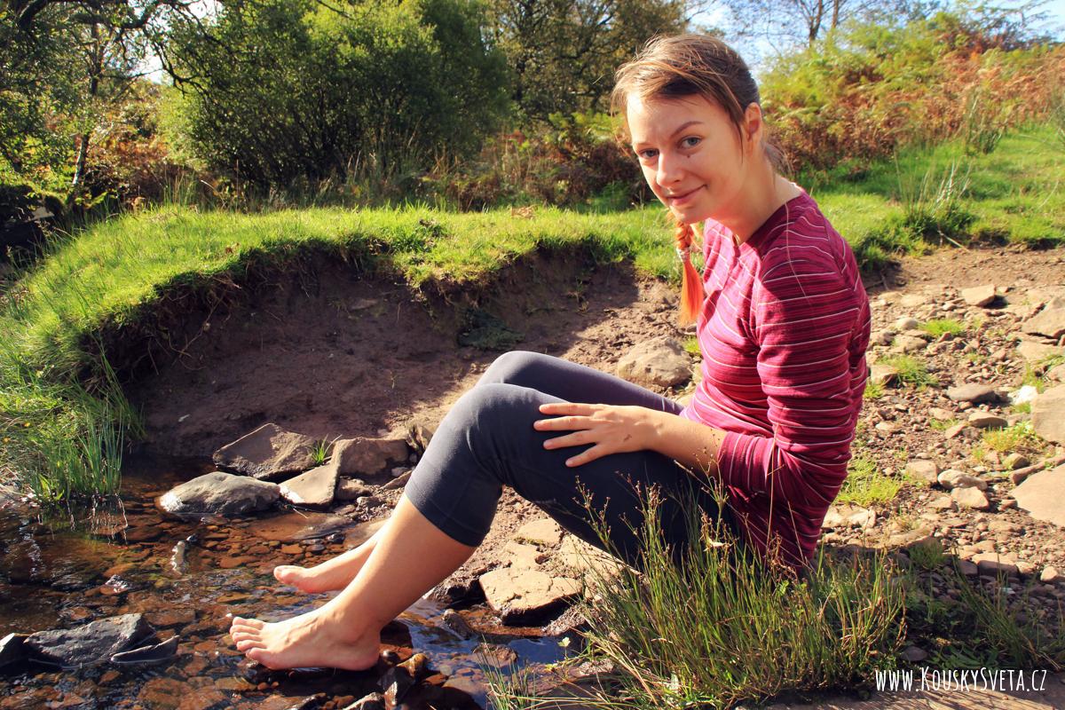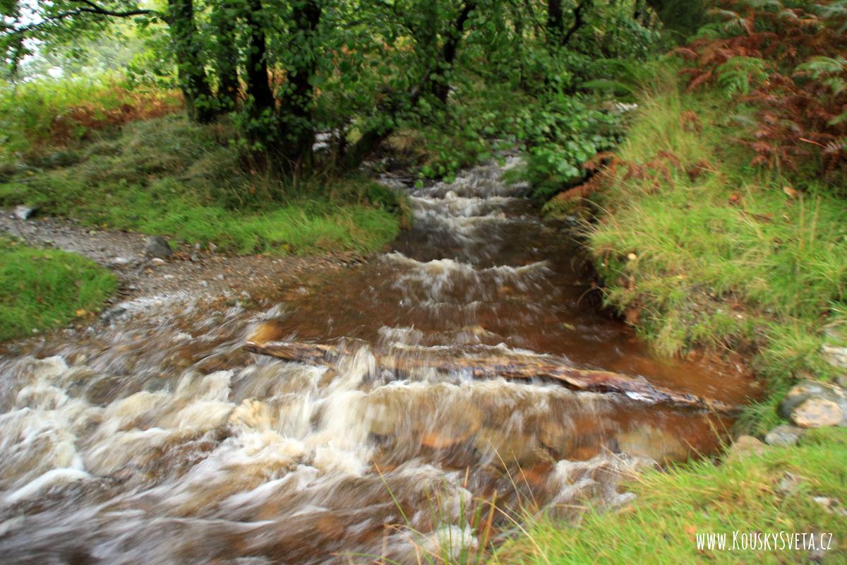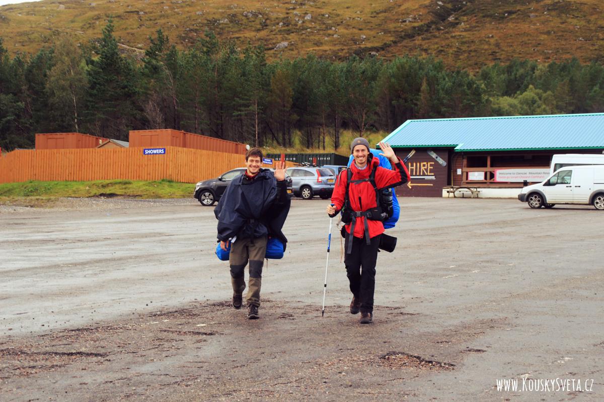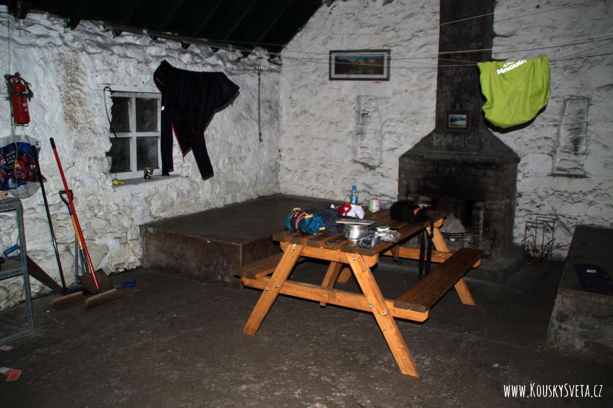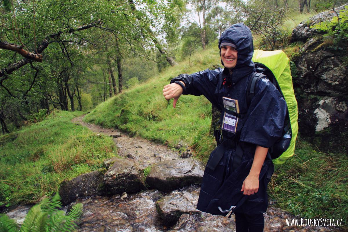 Ale pak to přišlo zas. Začalo pršet. Mě navíc začalo strašně bolet pravé koleno a levá noha, že jsem skoro ani nemohl pokračovat. Naštěstí mi Filip půjčil jeho hůlky, tak jsem několik posledních mílí absolvoval šnečím tempem s trpělivou Karčou za zády. Byli jsme zase úplně promáchaní. Došli jsme k jakémusi zimnímu středisku, které v těchto dnes sloužilo jako shelter pro trekaře. Usušili jsme naše oblečení a dali si něco k jídlu. Dala se pronajmou jakási “Hobití nora” pro 4 za 50 GBP, ale my se rozhodli, že budeme i v dešti stanovat. Během cesty jsme vystoupali poměrně vysoko, takže foukal i silný vítr. Začali jsme mít strach o náš milovaný (ale letitý) stan. Jednotlivé kolíky jsme proto zatížili pěkně velkými kameny. V noci foukal opravdu silný vítr. Nějak jsme nemohli usnout, ale Karča měla svůj MP3 přehrávač, takže jsme nakonec za uklidňujícího tónu kytary Neila Younga usnuli. Stan to vydržel.