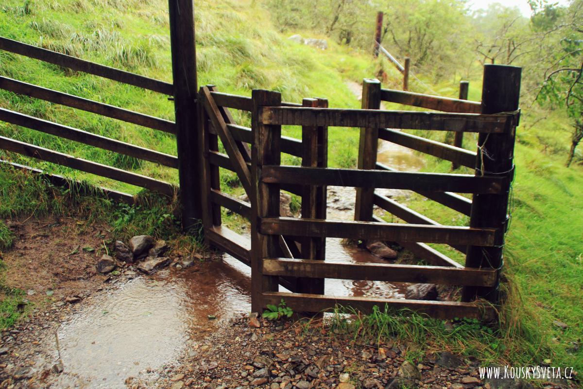 Stále prší. Silně pršelo celou noc. Budeme to muset nějak zvládnout do nejbližšího města, protože naše věci nestihly v bothie úplně uschnout. Nasadíme pláštěnky a jdeme. Z cestiček se se staly potůčky. Asi po pěti minutách jsme došli k rozlité řece. Nepůjde přejít suchou nohou. Musíme brodit. Zouváme boty, abychom zachránily poslední suchá místa. Proud není silný. jde přejít docela v pohodě, nakonec není voda ani tak ledová. Obouváme boty a jdeme dál.